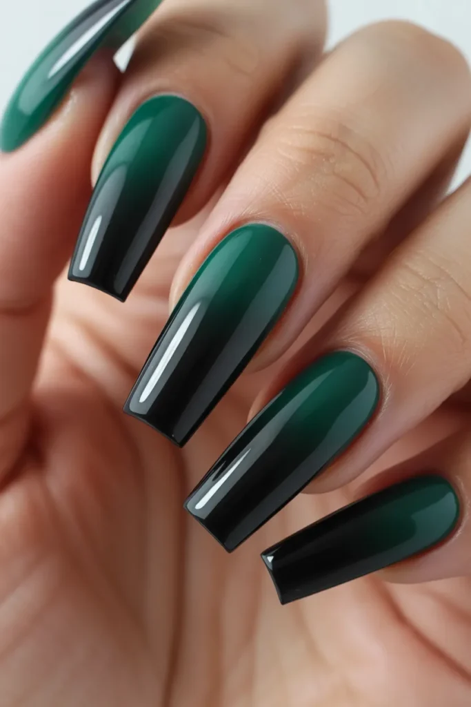 Blend dark green into black for dramatic effect. Perfect evening look.