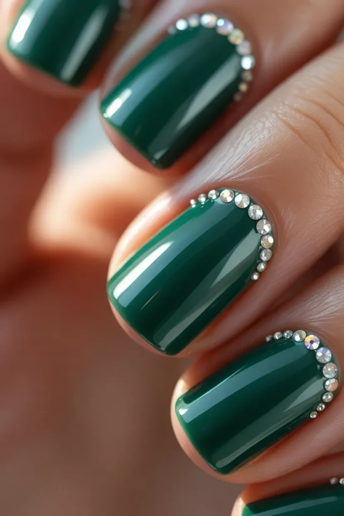 Add small rhinestones near cuticle on emerald nails. Glam but easy.