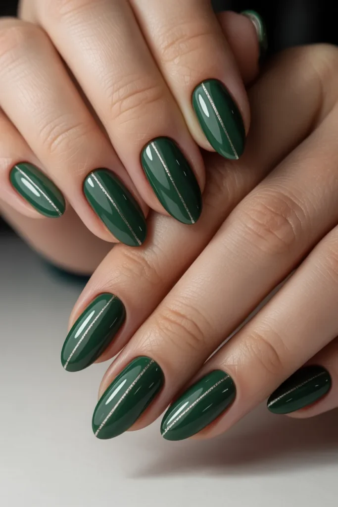 Add a thin silver stripe across forest green nails for elegance. Metallic tape makes it easy.