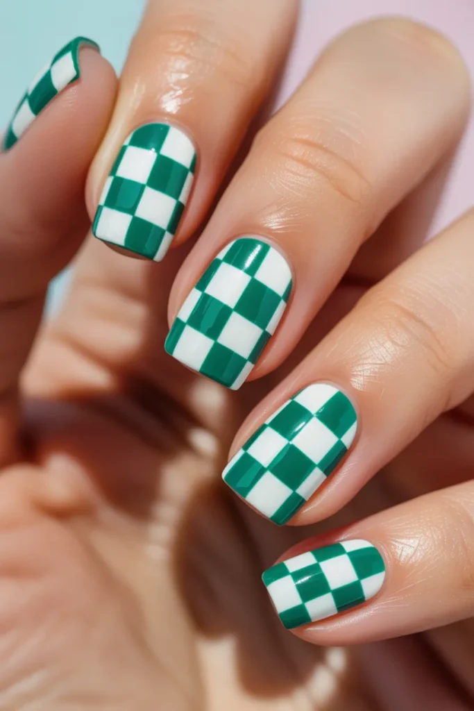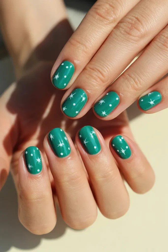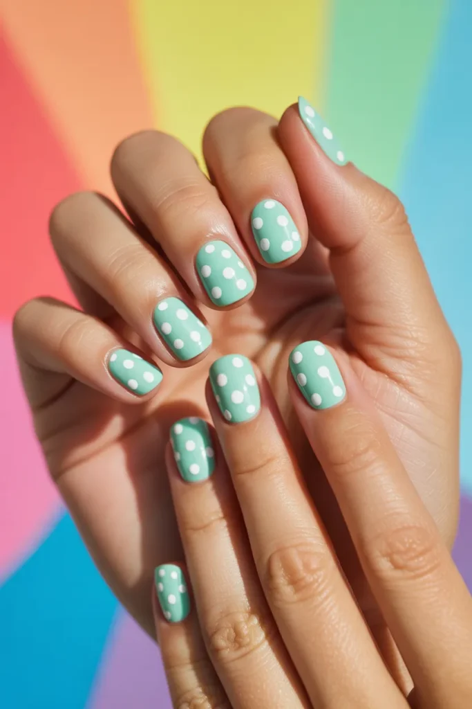 Use a pastel green base and create white polka dots with a dotting tool. This design feels cute and retro-inspired. Great for spring days.