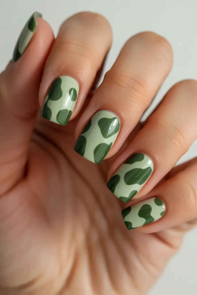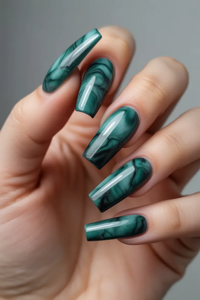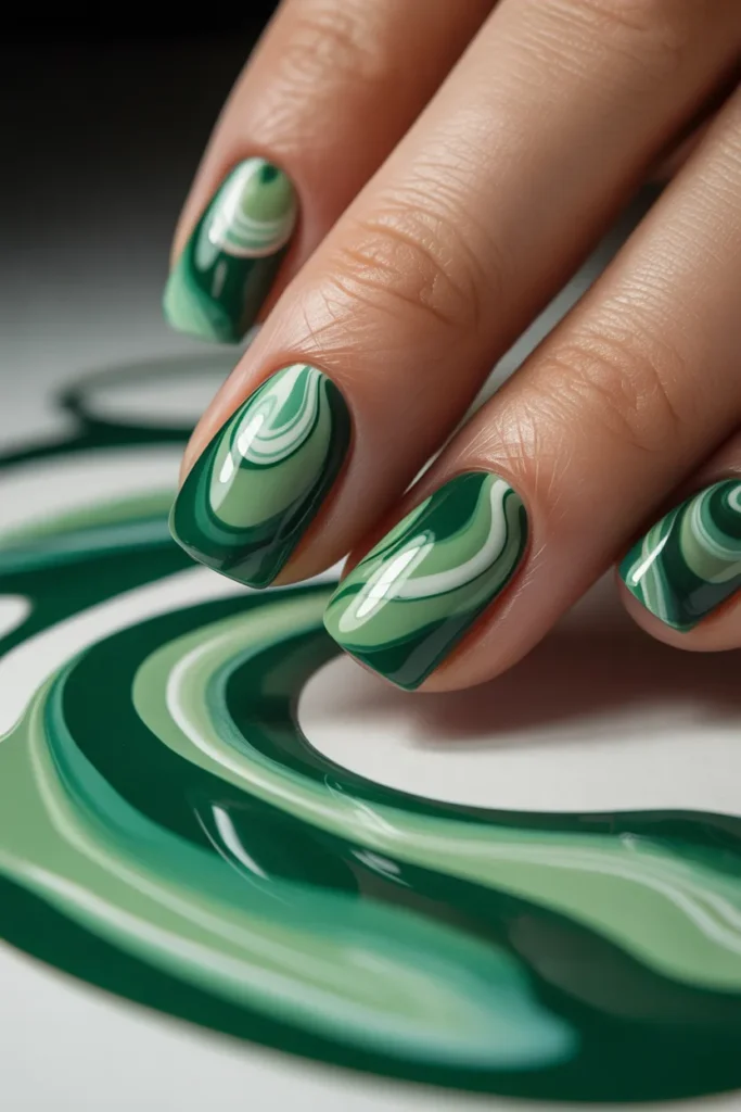 Mix dark and light green shades to create a marble effect. Use a thin brush to swirl colors before drying. Seal with glossy top coat.