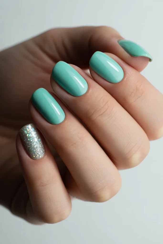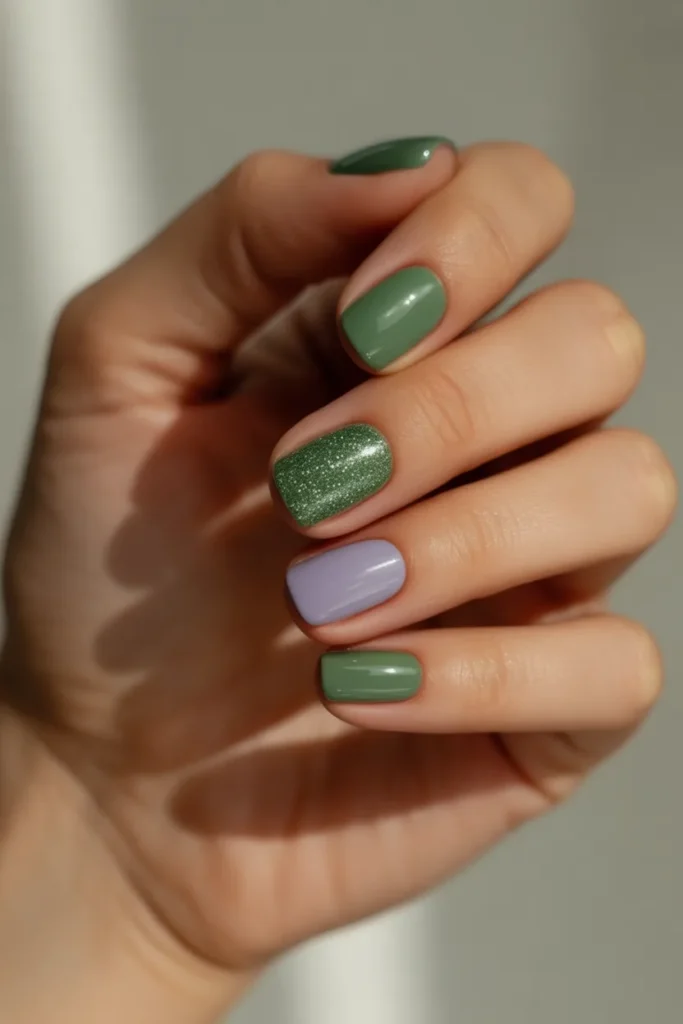 Paint most nails green and choose one lavender accent with green glitter overlay. This keeps the design balanced and stylish.