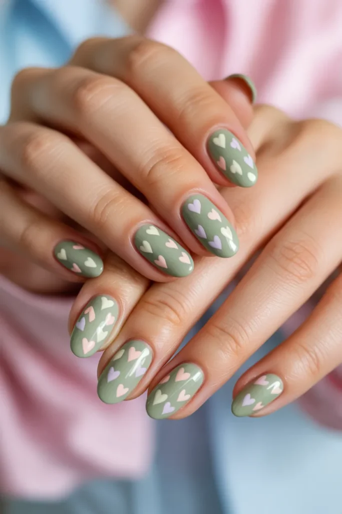 Draw tiny white or pink hearts on green base. Cute and romantic.