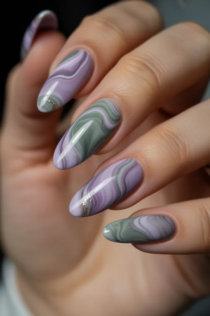 Blend lavender and green polish for a dreamy marble effect. Swirl gently with a toothpick before drying. Add glossy top coat for shine.