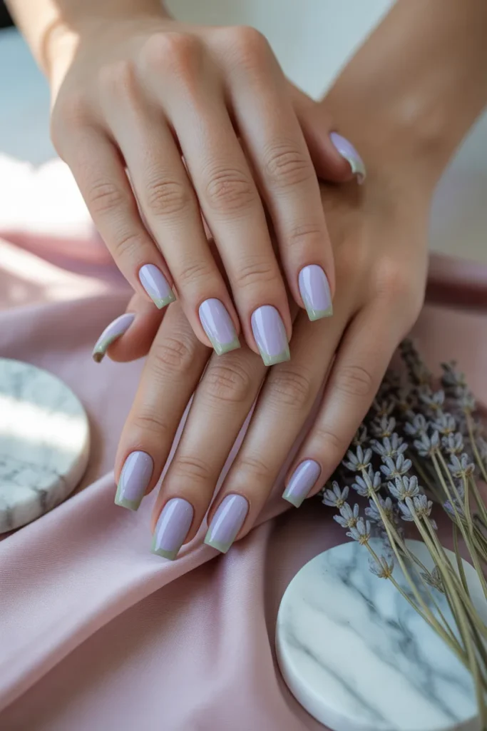 Use lavender as a base and create green French tips. The contrast looks modern and playful. Keep the curve smooth for neatness.
