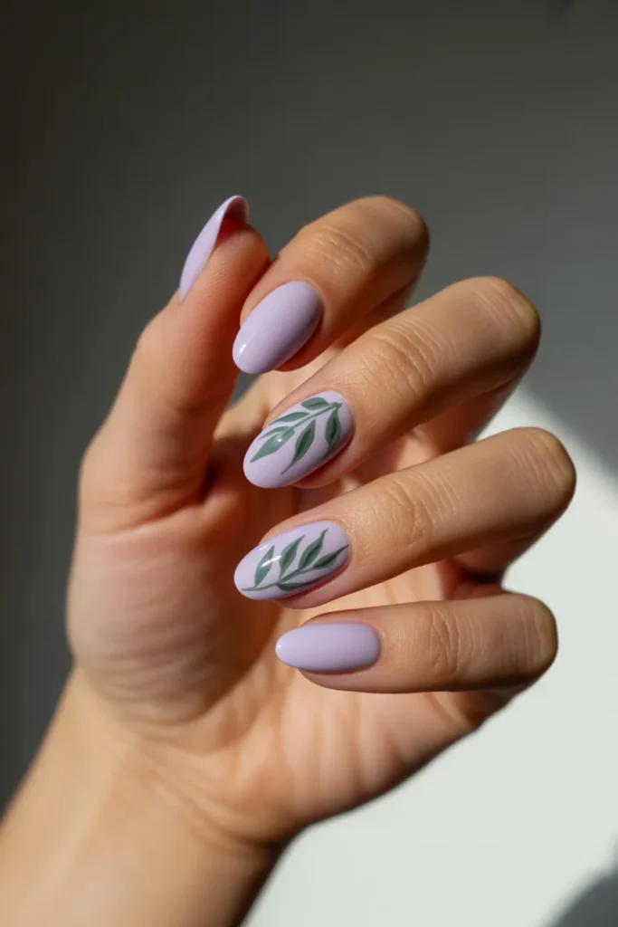 Paint nails lavender and add tiny green leaf accents. The floral touch creates a garden-inspired manicure. Use a thin brush for detail.
