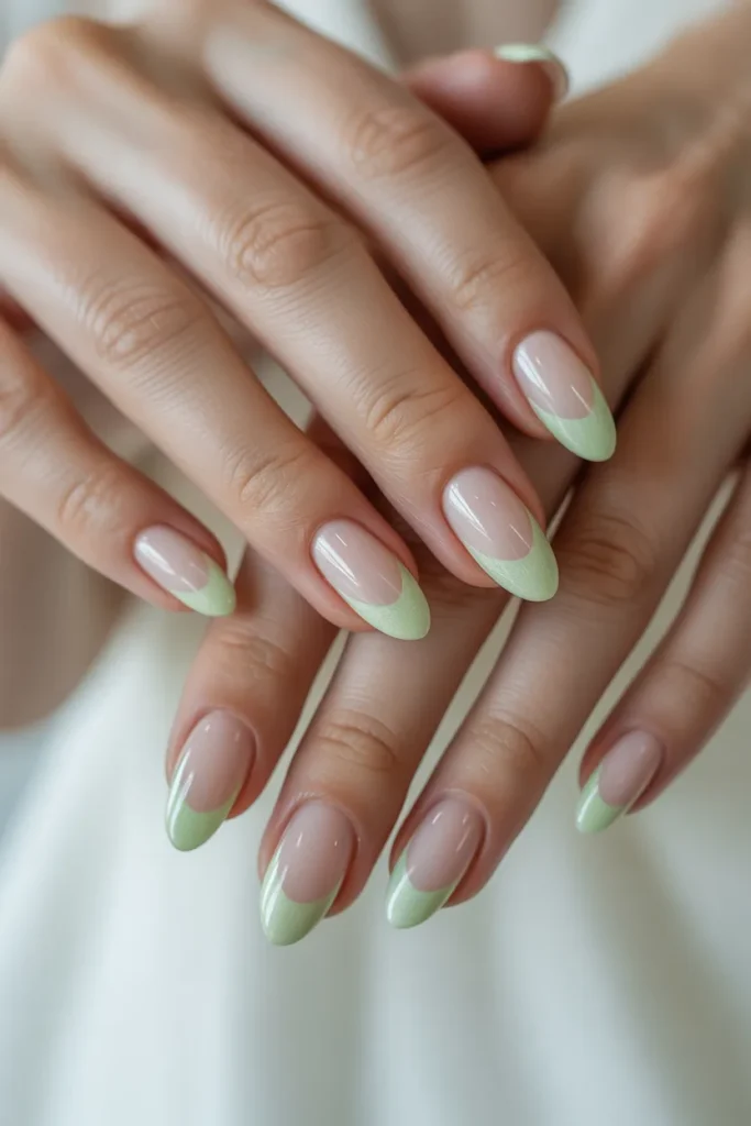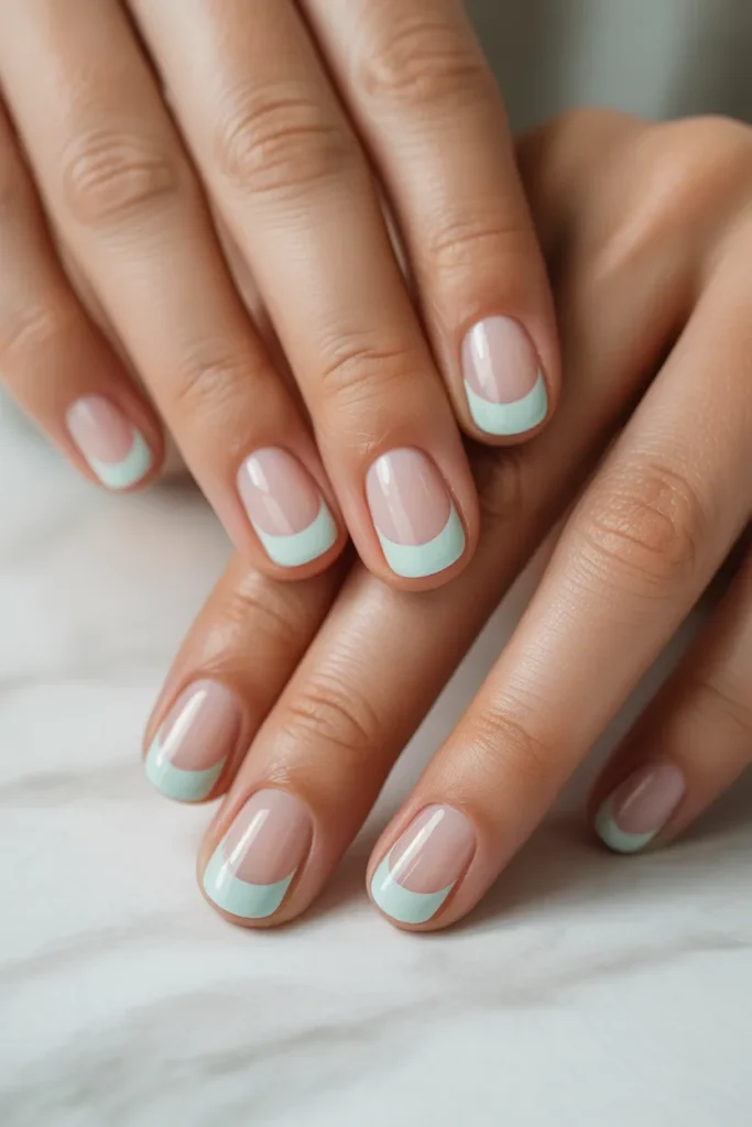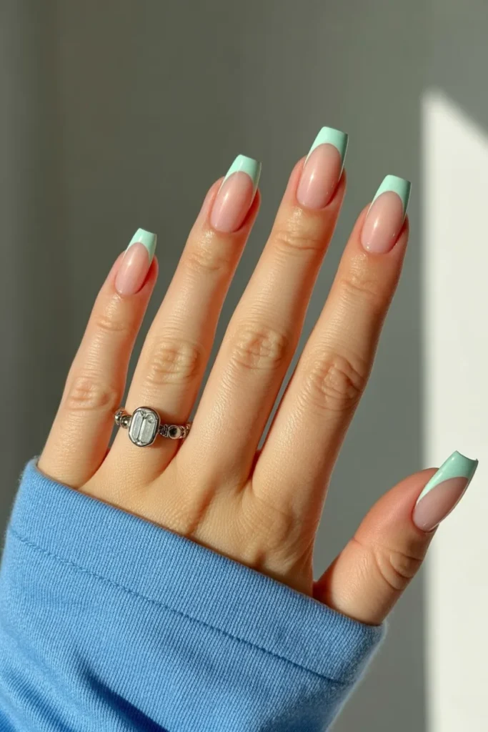 Instead of classic white tips, try mint green on nude nails. This twist on French manicure feels playful and fresh. Keep the lines thin for an elegant touch.