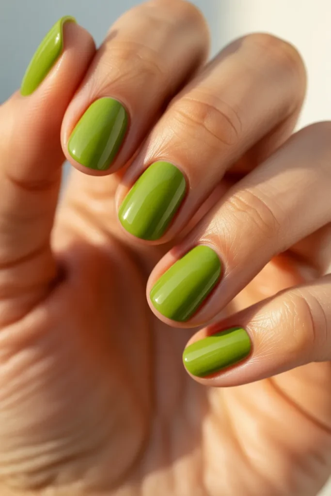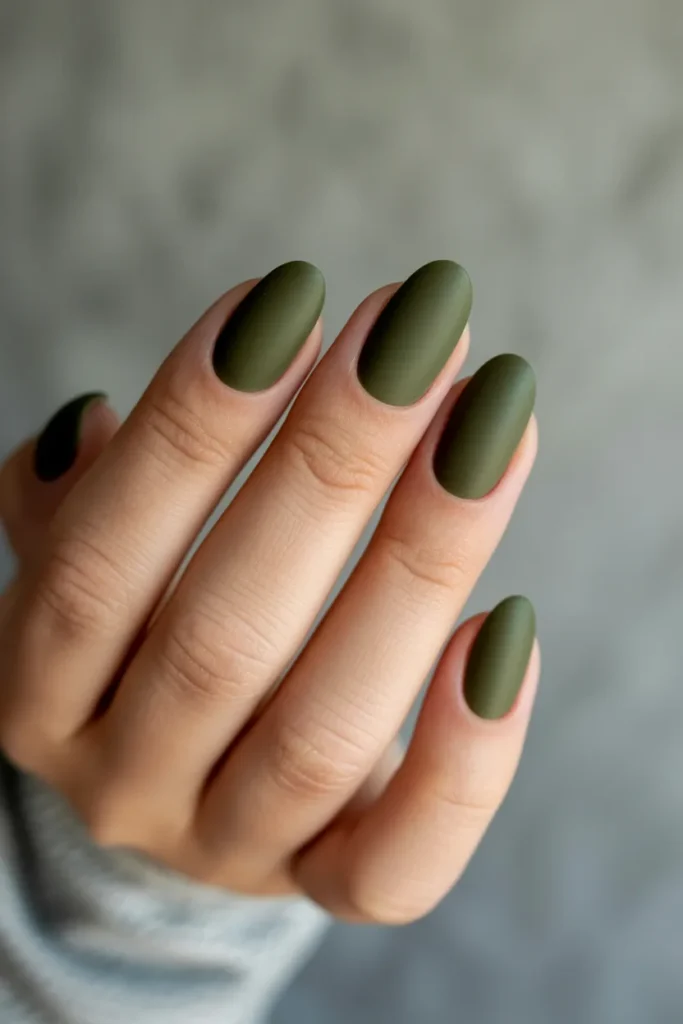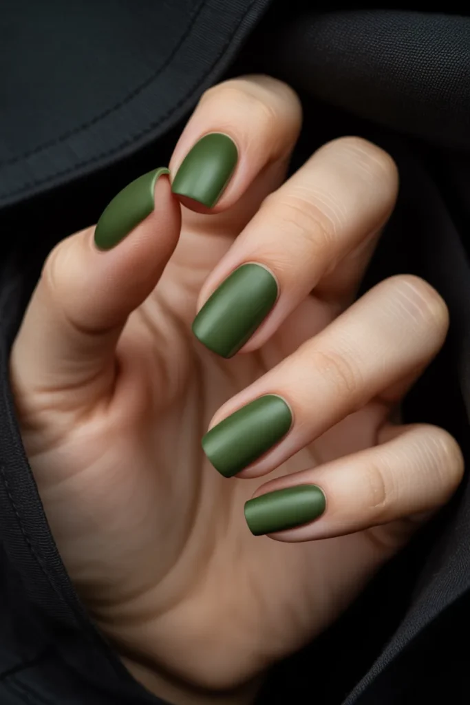 Olive green matte nails create a trendy and earthy vibe. Apply matte top coat for a smooth velvet effect. Perfect for fall-inspired looks.