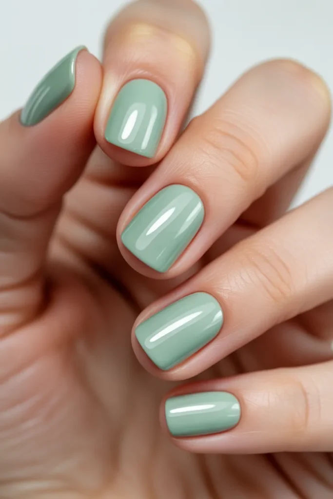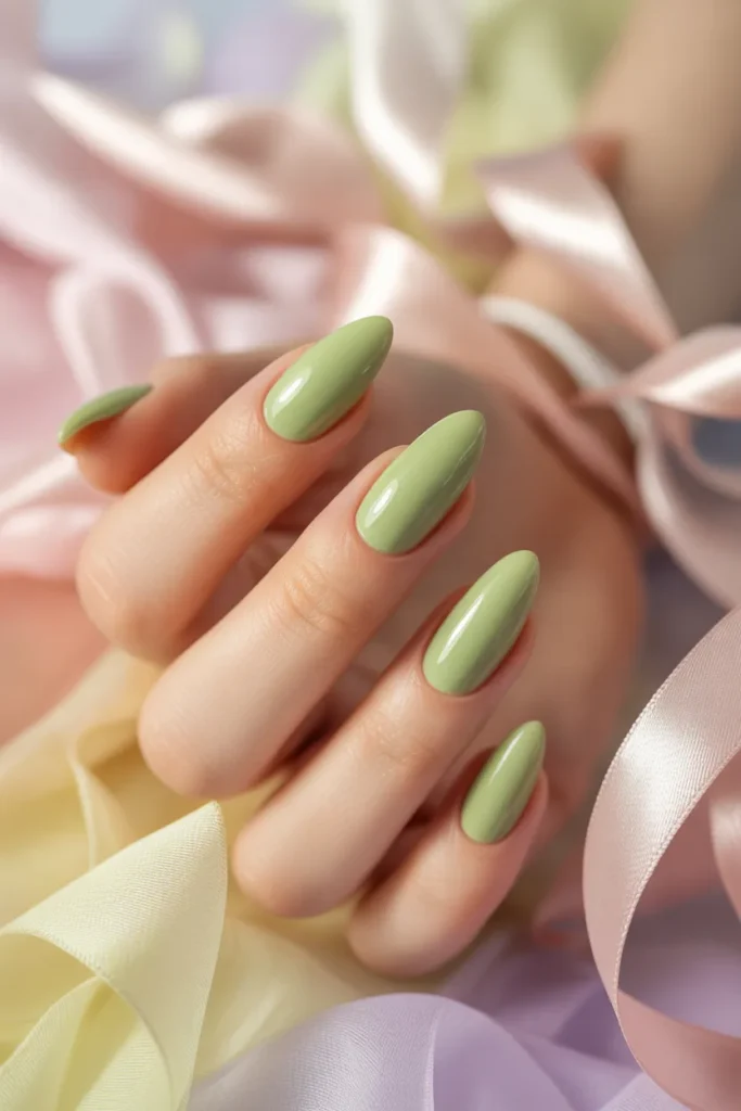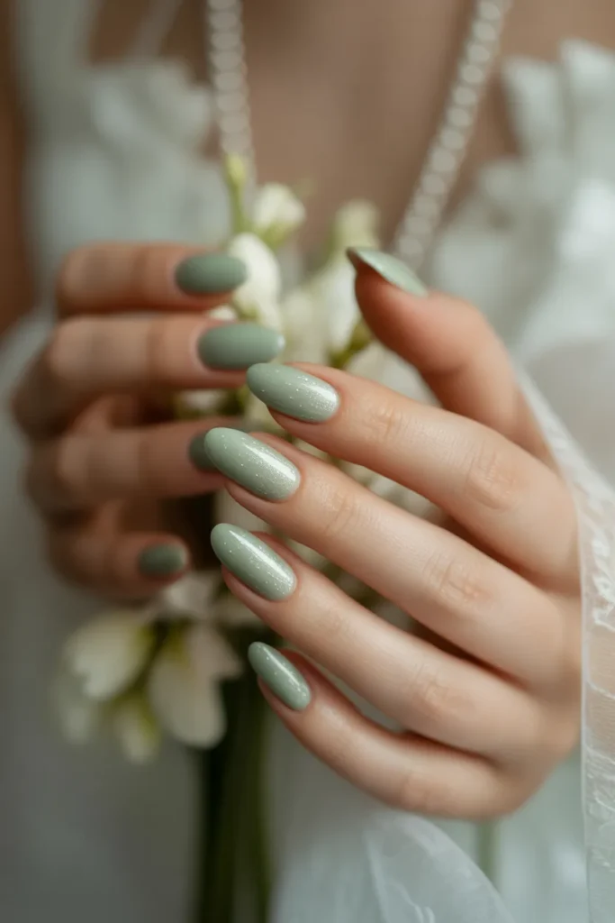 Light sage with subtle shimmer for elegant bridal style. Keep shape almond for grace.