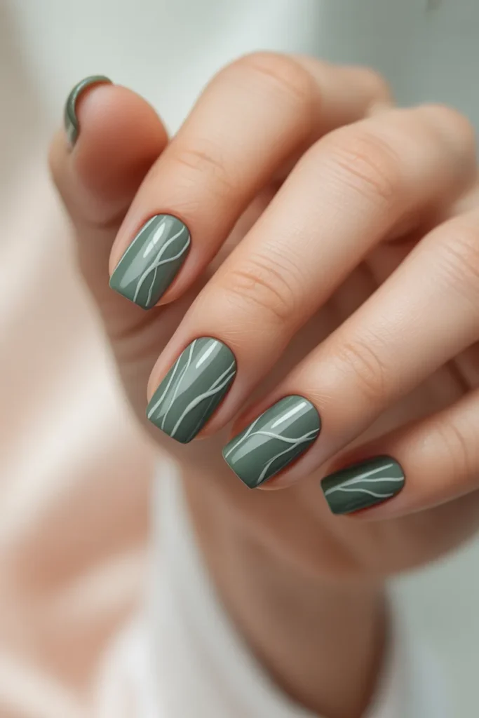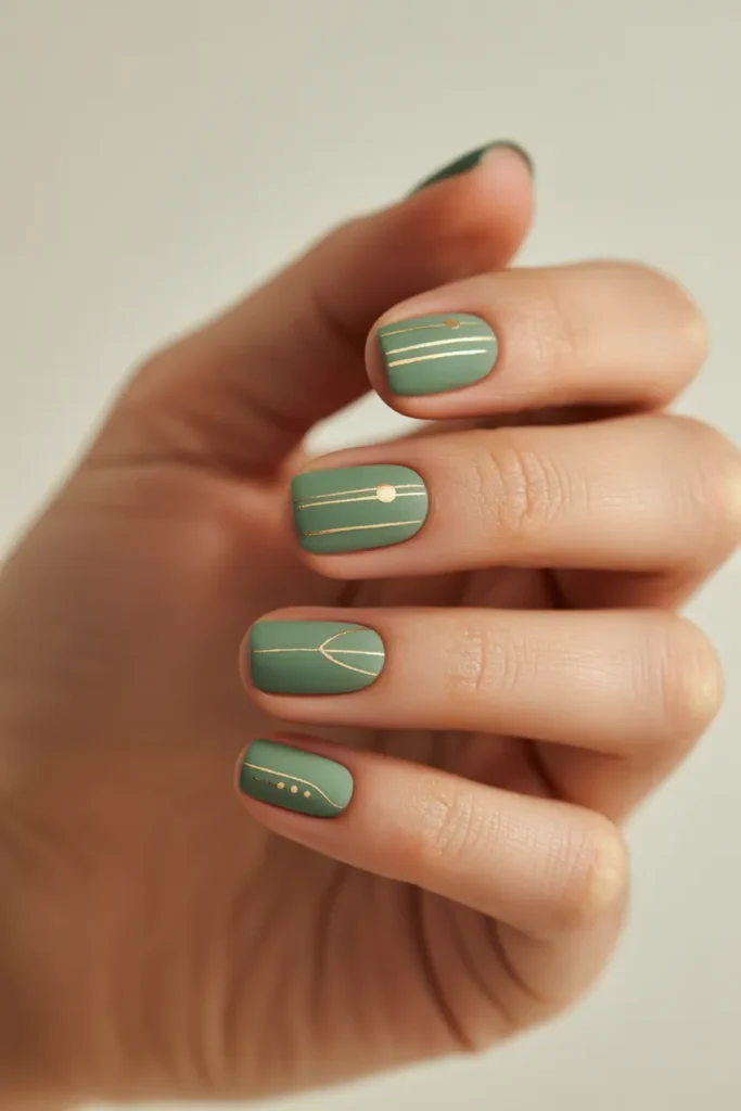 Add thin gold abstract lines over sage nails. Minimal luxury vibe.