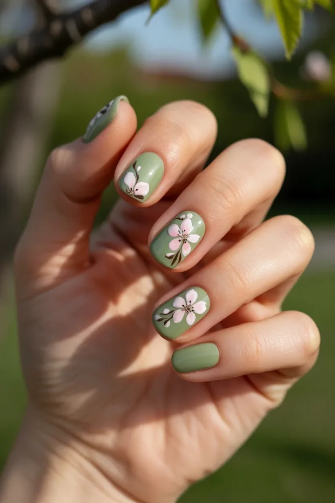 Simple sage base with tiny pink flowers on one nail. Soft and delicate.