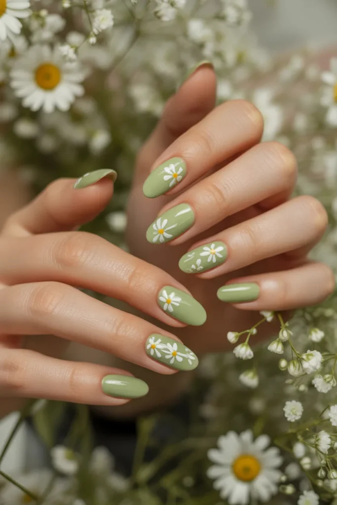 Paint nails sage green and add tiny white daisies on two fingers. It’s feminine and perfect for spring. Use a yellow dot for flower center.