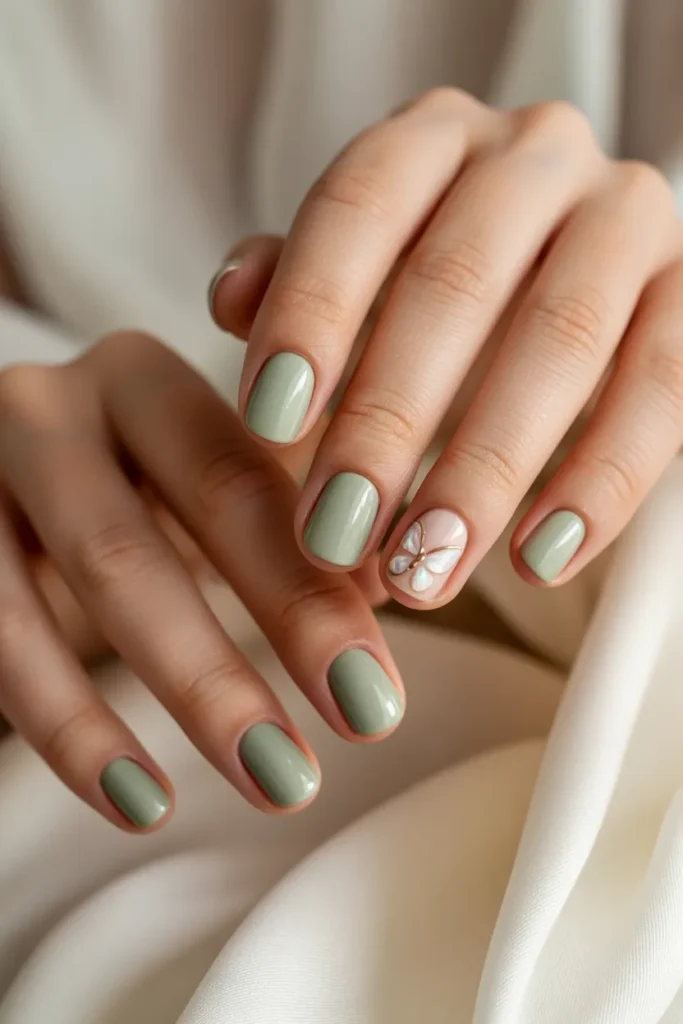 Sage nails with small butterfly sticker. Feminine and stylish.